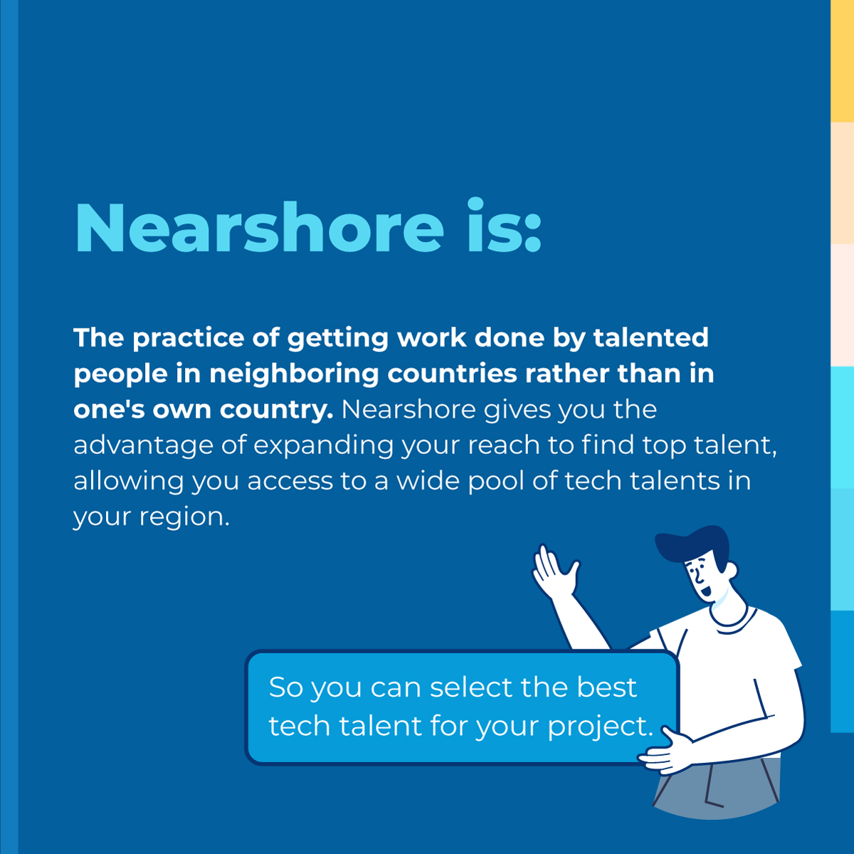 Nearshore is the practice of getting work done by talented people in neighboring countries rather than in one's own country. Nearshore gives you the advantage of expanding your reach to find top talent, allowing you access to a wide pool of tech talents in your region, so you can select the best tech talent for your project.